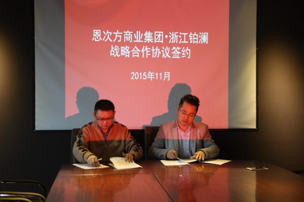 2015年11月9日,恩次方商业集团与浙江铂澜投资管理有限公司在杭州举行战略合作签约仪式,正式建立全面战略合作伙伴关系。 签约仪式上,浙江铂澜总经理邱炜萤与恩次方商业集团副总经理钟宇超共同签署了《战略合作及商业资源输出协议》,缔结战略合作关系。恩次方商业集团将发挥资源和专业优势,对浙江铂澜旗下十余个项目进行招商资源、品牌资源和运营管理技术方面的输出,针对各类商业项目的不同属性,提供商业定制化服务,突破项目现有发展瓶颈,打造出极具区域商业特色和持续竞争力的主题式商业。