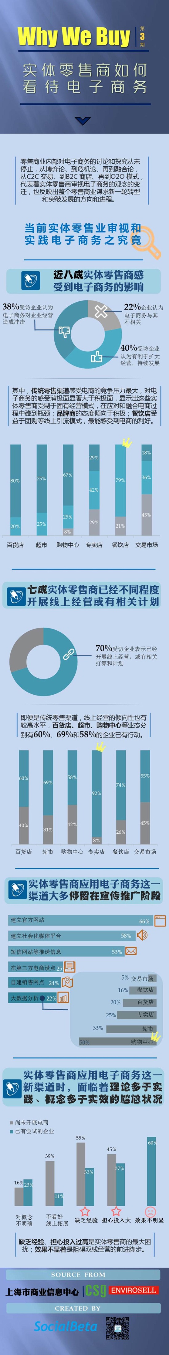近十年来,伴随信息技术和互联网络的不断进步升级,电子商务业蓬勃发展,几乎实现了对国民经济各个产业的辐射和渗透,其中对零售商业的影响和改造尤其突出,广受关注。 此次调查由上海市商业信息中心设计实施,共访问实体零售企业104 家,覆盖百货店、购物中心、超市、专业专卖店、餐饮店、交易市场等重点业态。调查样本以大中型企业为主,既有单体销售巨擘,也有连锁经营翘楚。调查结果主要有以下4方面的看点: 近八成实体零售商感受到电子商务的影响; 七成实体零售商已经不同程度地开展线上经营,或有相关计划; 实体零售商应用电子商务大多停留在宣传推广阶段; 实体商业应用电子商务仍面临理论多于实践、概念多于实效的尴尬。