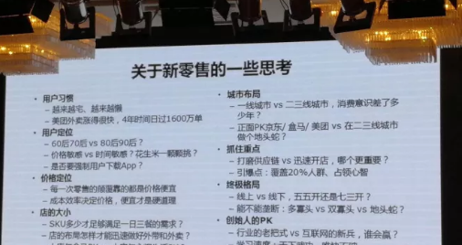 所以用户定位价格定位很重要,店大小就很不一样,你不能说只是一家店。为什么沃尔玛家乐福都没有外卖呢?因为店太大啊,一万来平米,就是你跑来跑去一个小时就没有了。新零售就不一样,前店后仓,拿货3分钟,包装7分钟,送货路上20分钟,半个小时就搞定了,传统方法做不到这一点你就输了,因为我们觉得刚需是人们越来越懒,送货上门半小时一定是标配,当这个成为标配的时候用户觉得非常爽,没有这个你就OUT了。