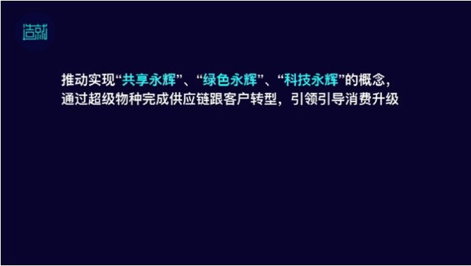 这是我们公司的理念,我们希望能够通过〝共享永辉〞,〝绿色永辉〞,〝科技永辉〞的概念,通过建立超级物种、永辉生活的新型供应链,实现公司的转型升级、引领消费升级。