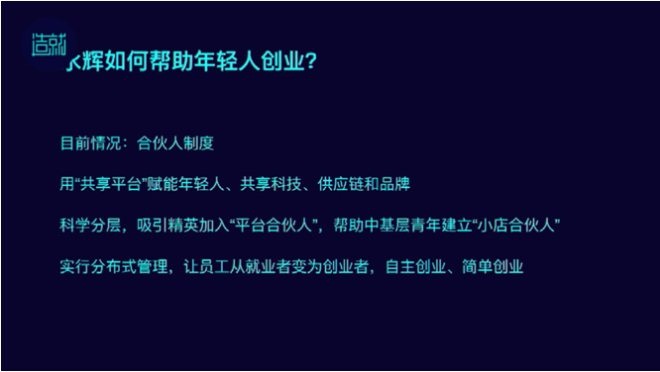 创业的机会,我们是组织创业的一个机会。现在我作为一个70后的代表,在这个创业的过程中间,我们已经开始慢慢的培养整个大的基础,现在我们各个大区各个省区的主管全部都是80后的,那我们实质上是用整个组织整个平台来支持创业。所以说我本身早期是永辉成就了我,所以说我们的一些理念首先核心是合伙人机制,然后我们希望共享平台,赋能青年人,共享科技、形成共享平台,我们希望通过科学分层引进菁英成为平台合伙人同时我们中基层实现帮助年轻人创业,通过管理,从员工从就业者变成创业者,让他们实现自主创业简单创业。