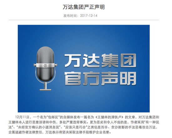 12月11日,兽爷在自媒体公众平台“包邮区”上发表了上述文章,对万达集团现状进行分析,并旋即刷爆了朋友圈。12月14日,万达集团正式发表官方声明,称该文对万达集团和王健林本人进行恶意诽谤和中伤,多处严重违背事实。万达集团已决定向公司属地公安部门报案追究作者刑事责任。
