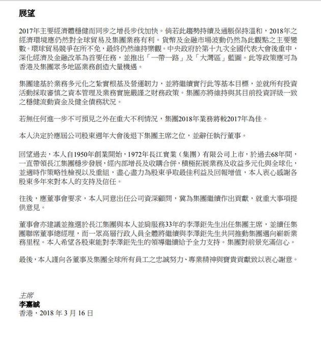 图片来源:视觉中国(资料图) 李嘉诚退休声明全文: 本人决定于应届公司股东周年大会后退下集团主席之位,并辞任执行董事。 回望过去,本人自1950年创业开始,1972年长江实业(集团)有限公司上市,于过去68年间,一直带领长江集团稳步发展,经内部增长及收购合并,积极拓展业务及收益多元化与全球化,并适时作策略性检视以及重组,尽心尽力为股东争取最佳利益及回报增值,本人衷心感谢各股东多年来对本人的支持及信任。 往后,应董事会要求,本人同意出任公司资深顾问,冀为集团继续作出贡献,就重大事项提供意见。 董事会亦建议并推选于长江集团与本人并肩服务33年的李泽钜先生出任集团主席,并续任集团联席董事总经理,而一众高层行政人员全体将继续与李泽钜先生共同推动集团迈向崭新业务里程。本人希望各股东能对李泽钜先生的领导继续给予全力支持。集团对前景充满信心。 最后,本人谨向各董事及集团全球所有员工之忠诚努力、专业精神与宝贵贡献致以衷心谢意。