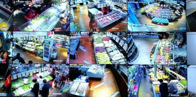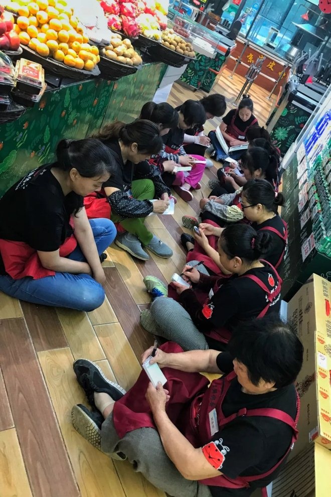 打扫完卫生,店员坐在地上开早会 门店卫生最初让店长负责实施,执行一段时间发现很容易被遗忘和遗漏。后来,由总部做成计划,每周循环执行,总部督促。在生鲜传奇总部办公室,有一间不足20平米的监控室,坐着两位员工,盯着15块大屏幕,360度无死角全程监控,45秒轮换一次。工作人员检查门店的执行,手里记录着看到的信息。
