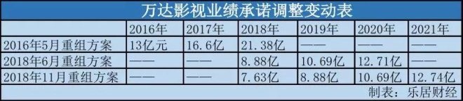 去年11月27日,万达电影正式抛出第三版重组方案,万达投资和莘县融智、林宁女士承诺万达影视2018至2021年的净利润数分别不低于7.63亿元、8.88亿元、10.69亿元、12.74亿元。 而在上一个版本的方案中,对赌协议的业绩承诺是2018至2020年净利润数分别不低于8.88亿元、10.69亿元、12.71亿元。 这一前一后的变化,增加了一年的业绩对赌。然而对比发现,2018-2020年几乎每年都下调了1-2亿元。 值得注意的是,万达影视2018年的业绩承诺从第一版中的21.38亿元大幅缩减至7.63亿元,缩水了64%。显然,王健林预料到影视寒冬下,业绩达标恐有困难。 |