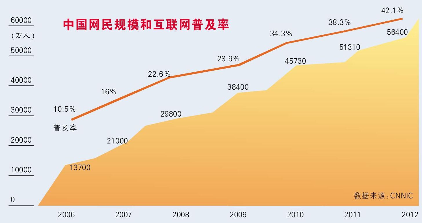 上图是2006年到2012年中国网民规模和互联网普及率示意图。中国网民的数量也是呈现快速增长。2013年的网民数量已经超过了6亿人。